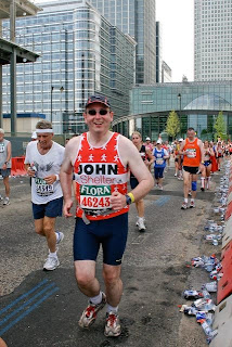 Running through the Isle of Dogs was better than I had hoped. Before I knew it I was running along Bank Street in Canary Wharf and got a message from Shelley and Marc that they had positioned themselves by Barclays. I ran past Citigroup, Morgan Stanley, Credit Suisse, BarCap, HSBC and then, there they were, dressed in red tee shirts and armed with cameras. I hope the pictures are flattering! (I’ve added one of the pictures now. I seem remarkably happy!)